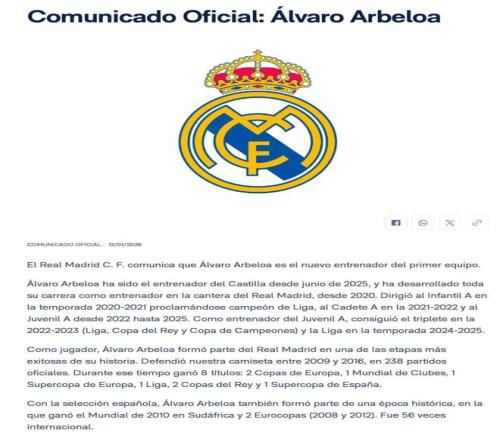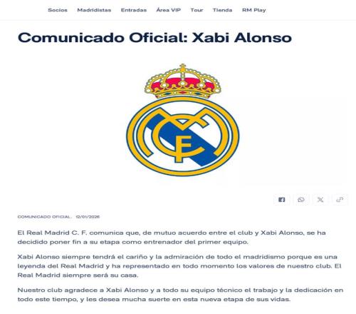 北京时间1月13日凌晨,皇家马德里俱乐部官方宣布,与主帅阿隆索协商一致,他将结束在皇马的执教,同时宣布B队主帅、球队名宿阿韦罗亚将出任球队临时主帅。