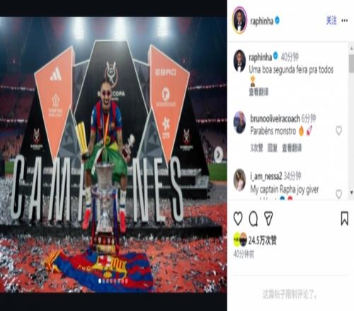 体育播报01月13日宣 在独进两球率领巴萨3-2战胜皇马,夺得西超杯冠军后,拉菲尼亚在40分钟左右前更新了个人社媒,他晒出了自己与队友一起捧杯、庆祝夺冠的照片,并写道:“祝大家周一愉快